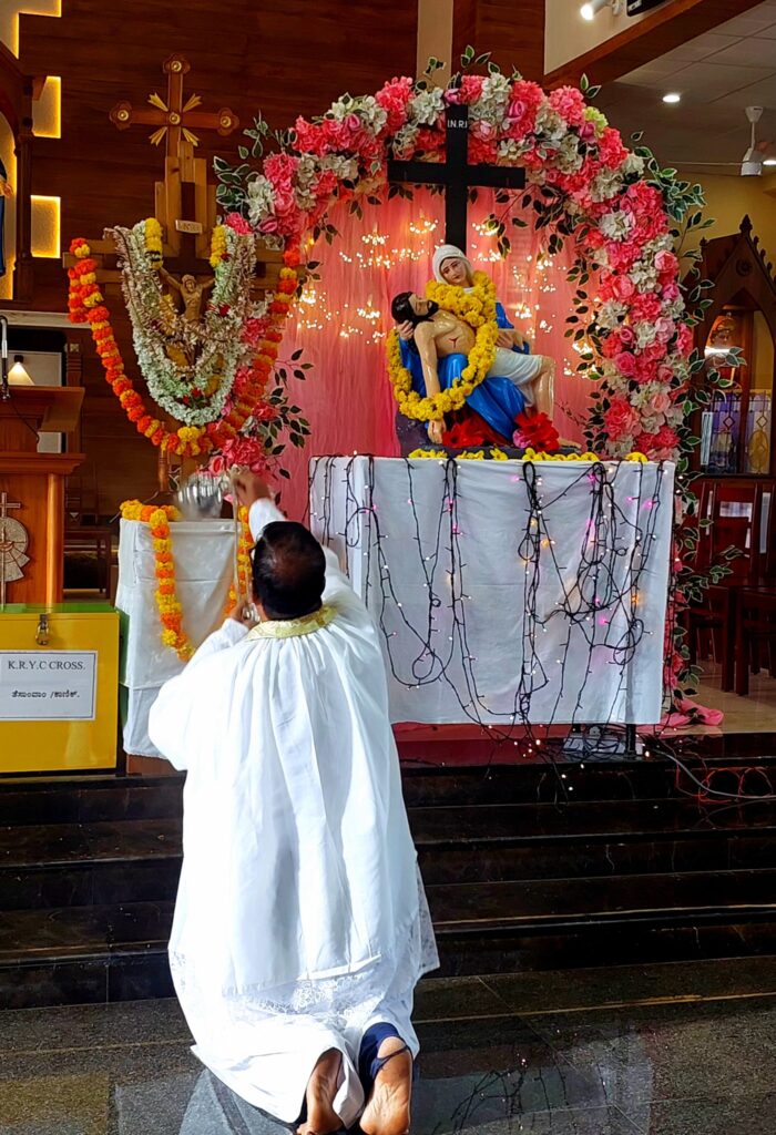 Fr Andrew reverently incensed the Holy Cross, as a symbol of prayer rising to God, while Alrick D’Silva led the faithful through the sacred rites with his narration. Rev. Fr Lawrence Cutinha then proclaimed the life-giving Word of God, after which Rev. Fr Andrew Leo D’Souza offered a deep and inspiring reflection, inviting the faithful to contemplate the saving power and profound mystery of the Cross.
