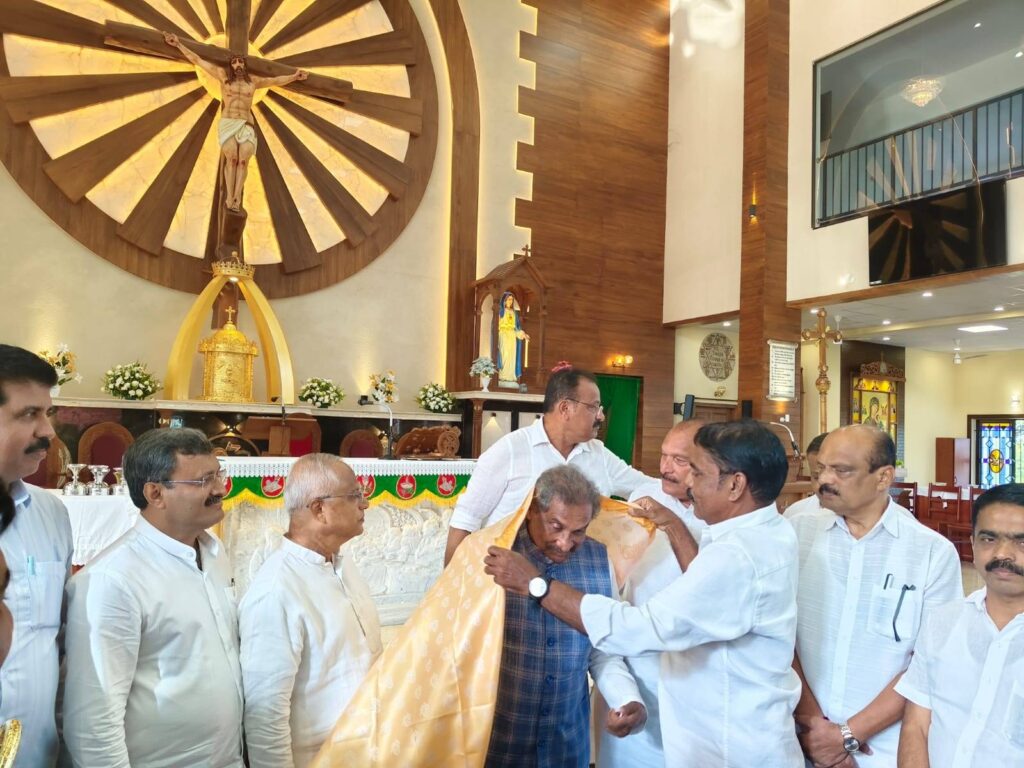 A felicitation ceremony followed, during which Mr Rudy Pinto, former Vice President of the Parish Pastoral Council, felicitated Mr K. J. George with a flower Bouquet,shawl, memento, and garland as a token of respect and appreciation.