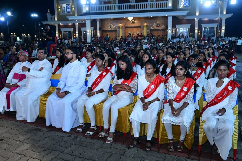 Soon after the Mass, all the Confirmation children, donors, and sponsors joined the procession along with the Bishop and priests, walking to the open church grounds for the felicitation programme. The programme commenced with a prayer song. Rev. Fr Andrew Leo D’Souza welcomed the gathering, thanked the donors for their generous presence, and congratulated the children who received the Sacrament of Confirmation. Out of the 90 children, three exceptionally gifted students were felicitated by the Bishop with flower bouquets for being witnesses of Christ.