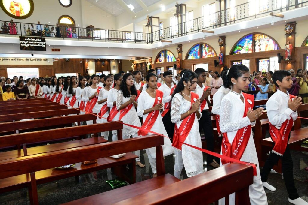 St Lawrence Church & Shrine witnessed a solemn triple celebration on November 18, 2025, marked by the Sacrament of Confirmation, the First Anniversary of the renovated church, and the felicitation of donors. Most Rev. Dr Robert Michael Miranda, Bishop of Gulbarga, presided over the Eucharistic Mass. The concelebrants included Rev. Fr Andrew Leo D’Souza, Parish Priest; Rev. Fr Peter Gonsalves, Principal of St Lawrence English Medium School; Rev. Fr Lawrence Cutinha; Rev. Fr Arul -Betharram; Rev. Fr Peter Mascarenhas; Rev. Fr Ivan Peter Cordeiro, Asst. Manager, Codialbail Press ; Rev. Fr Ravi Kumar, MSIJ; and Rev. Fr James Britto, MSIJ. During the solemn liturgy, Bishop Robert administered the Sacrament of Confirmation to 90 children of St Lawrence Church, Bondel, at 5:00 p.m.